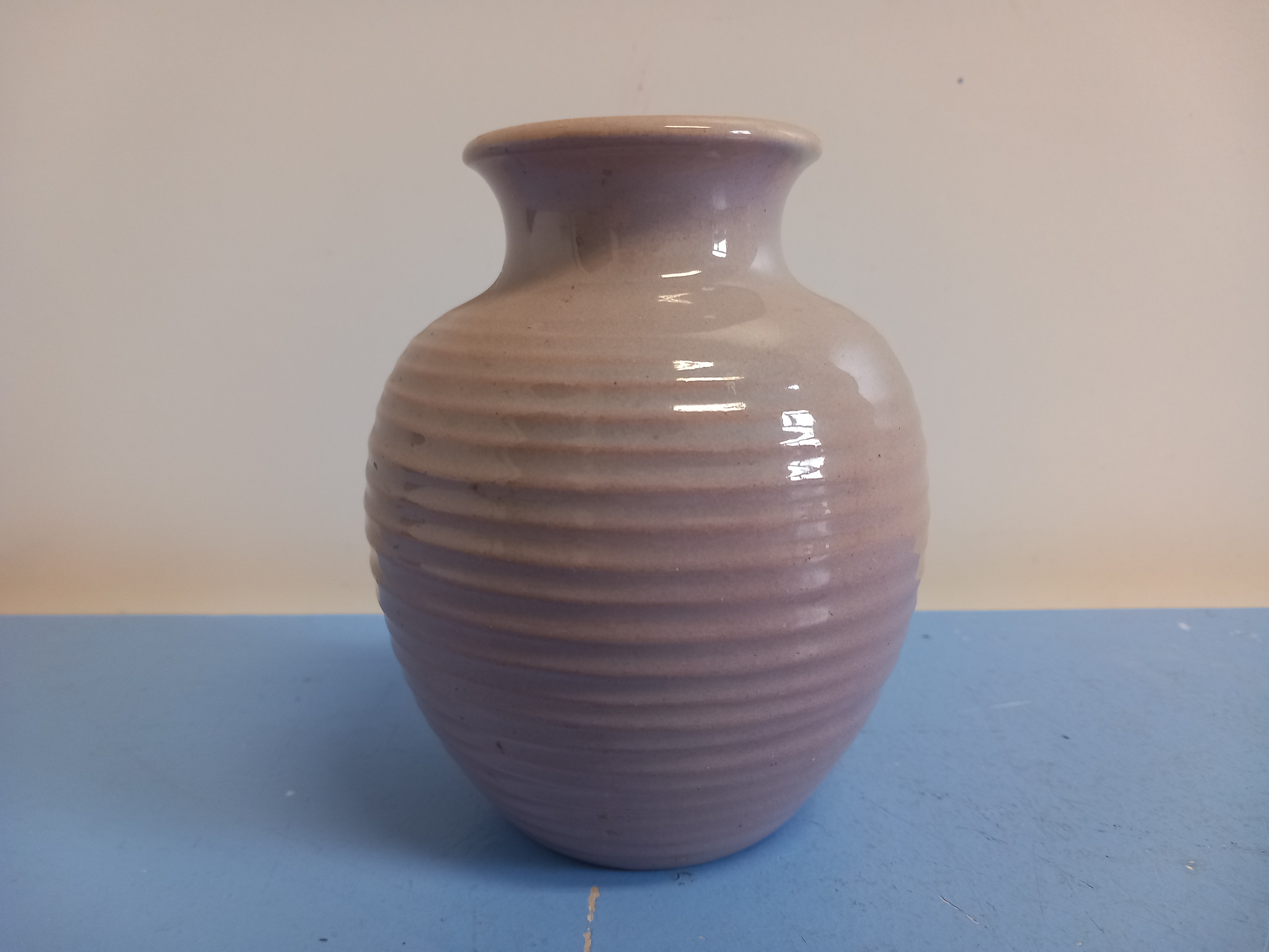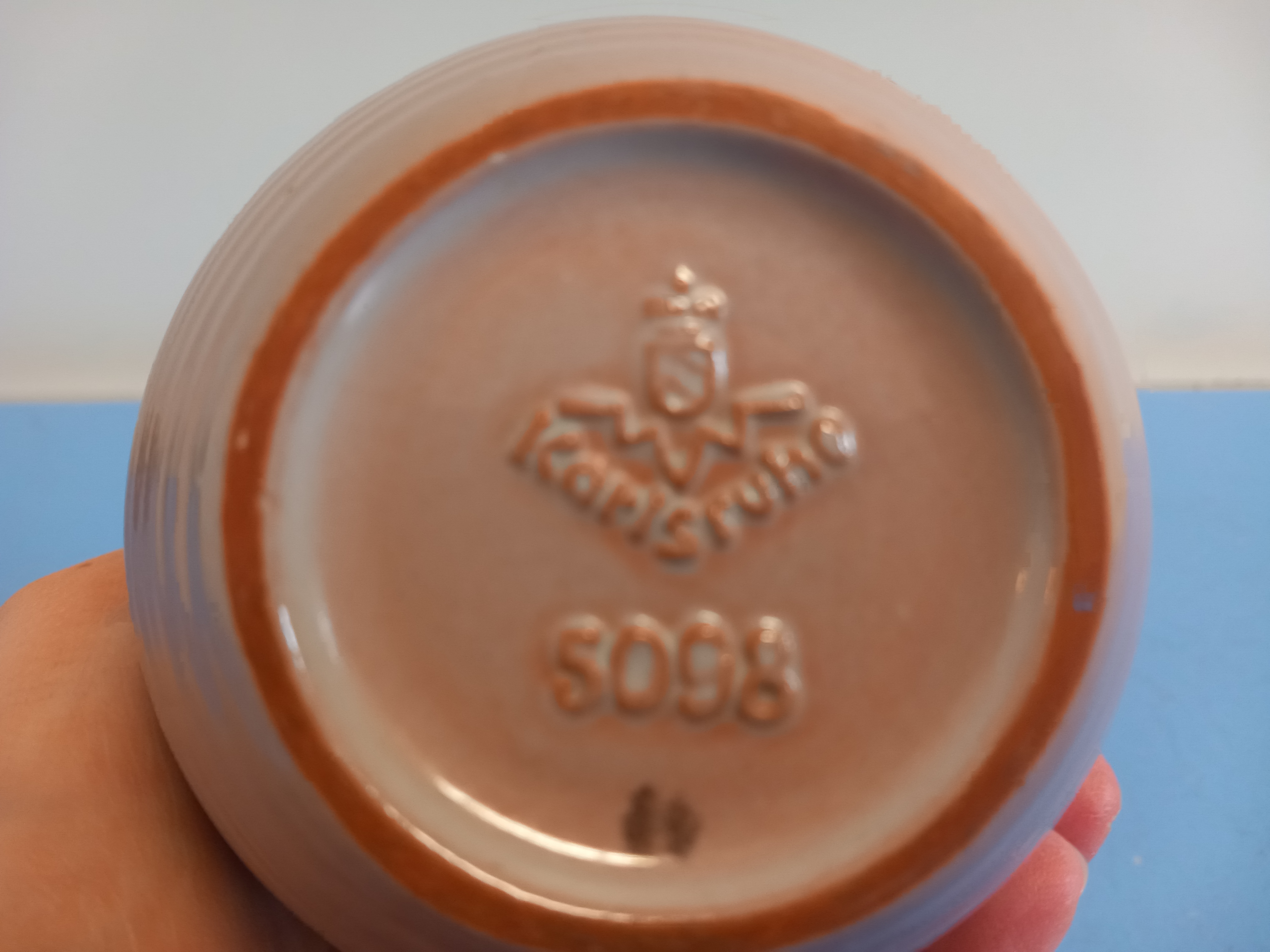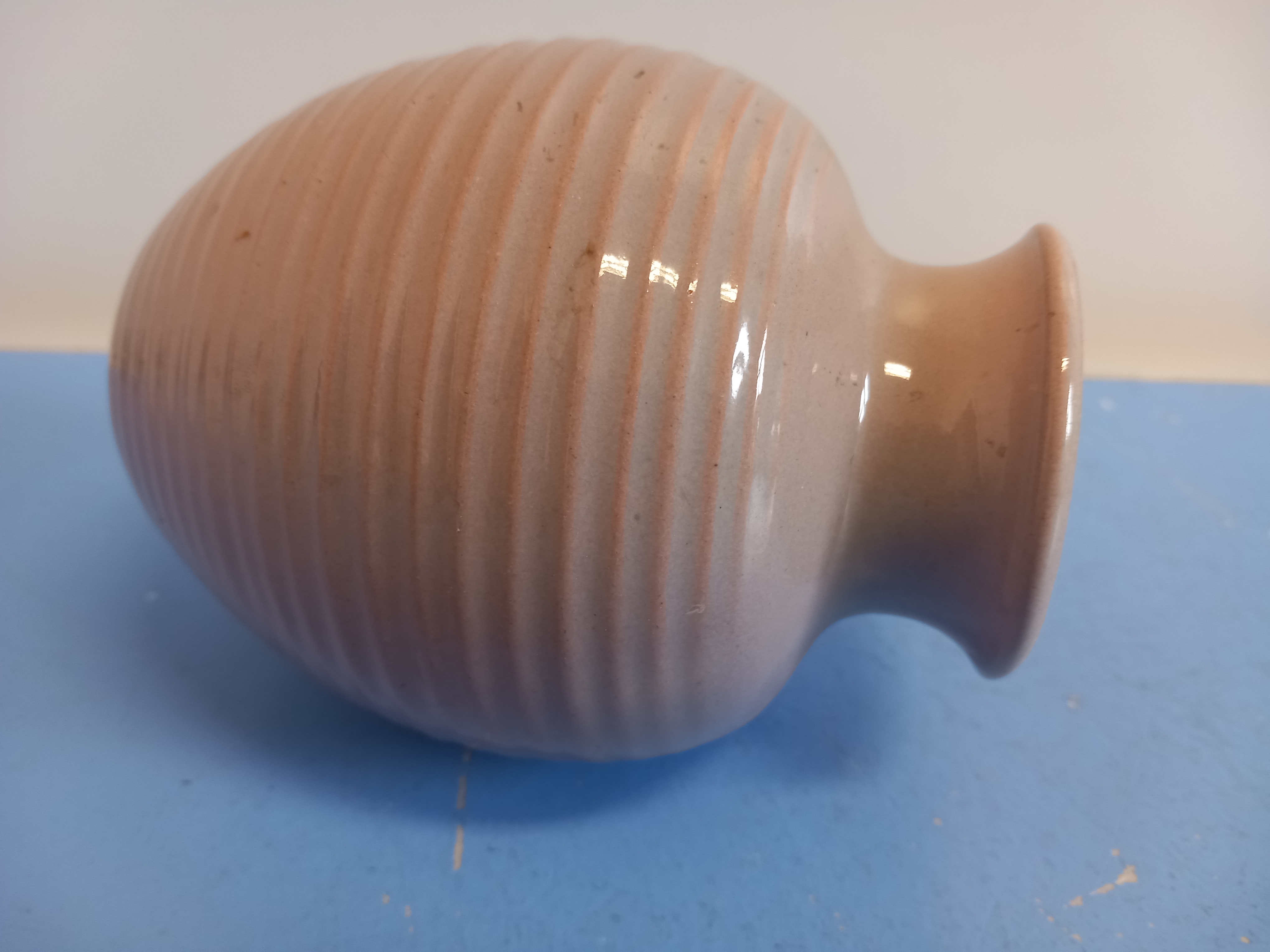 Vase der Karlsruher Majolika, Entwurf Martha Katzer. Ausführung 1939 - 1962. Bauchige Form mit Rippenrelief. Brauner Scherben mit semi-transparenter Glasur in altrosé. Höhe 13 cm. Unterseitig mit Karlsruhe-Stempel plus Modellnummer 5098. Perfekter Erhaltungszustand, keine Gebrauchsspuren.